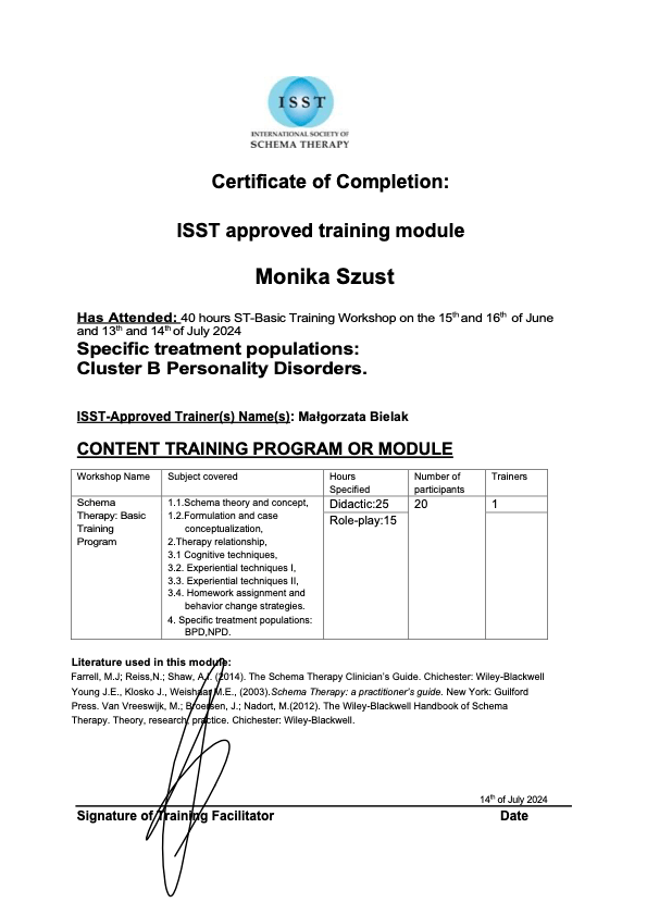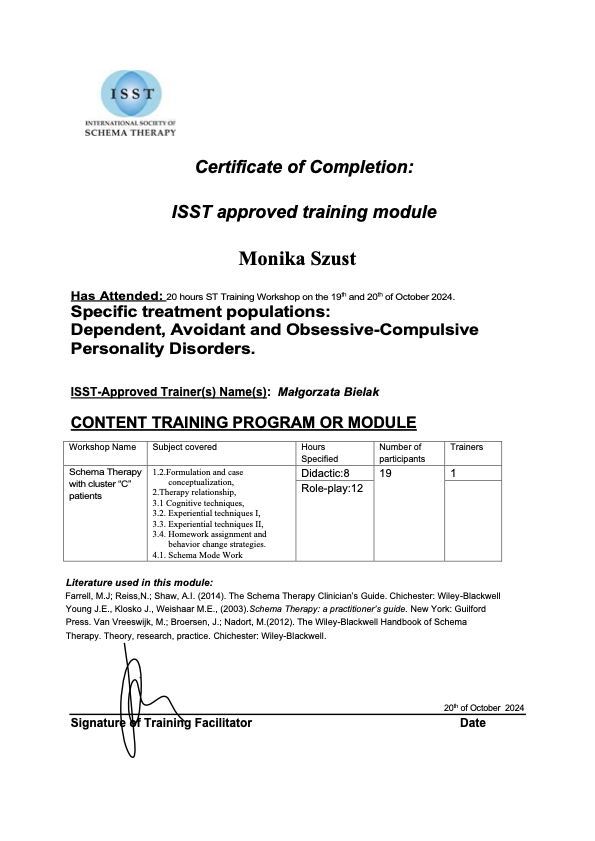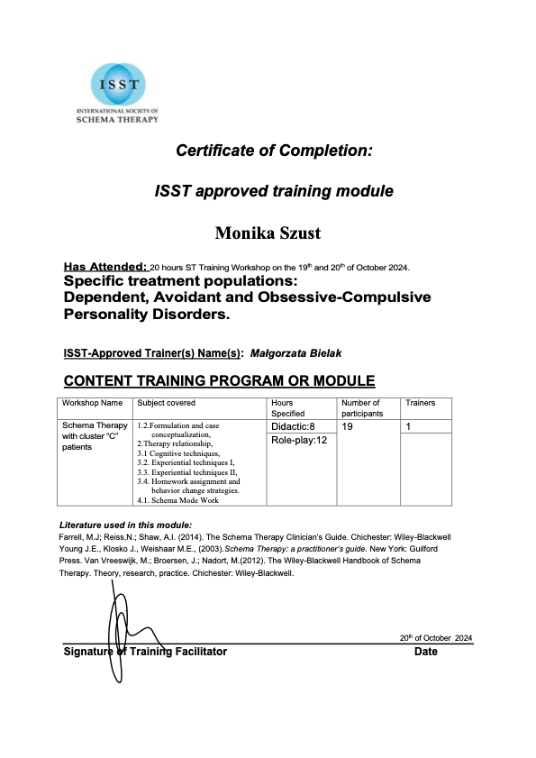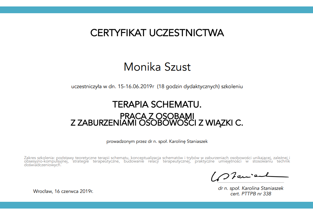 Jestem psychoterapeutką poznawczo-behawioralną(Certyfikat nr 761, certyfikaty cbt). Prowadzę psychoterapię osób dorosłych i młodzieży.
