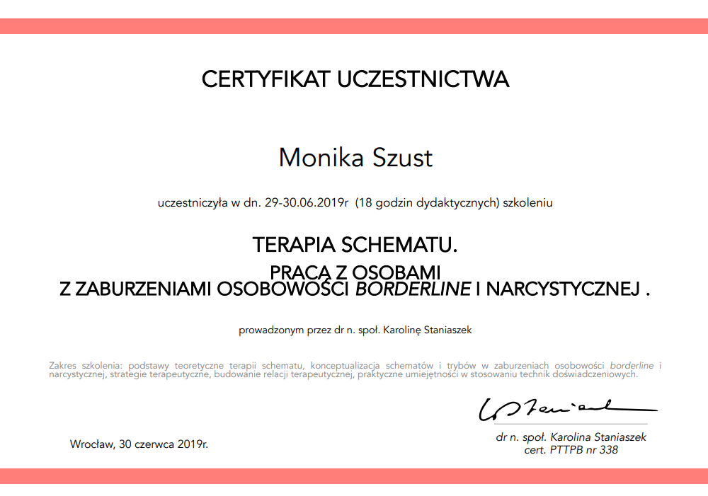 Ukończyłam psychologię na Uniwersytecie Wrocławskim i Szkołę Psychoterapii Poznawczo – Behawioralnej dr E. Pragłowskiej i dr A.Popiel na Uniwersytecie SWPS. Ukończyłam Kurs Psychoterapii Poznawczo- Behawioralnej Dzieci i Młodzieży w Centrum CBT w Warszawie. Jestem członkiem Polskiego Towarzystwa Terapii Poznawczej i Behawioralnej (PTTPB) należącego do European Associoation for Behavioural and Cognityve Therapies (EABCT).